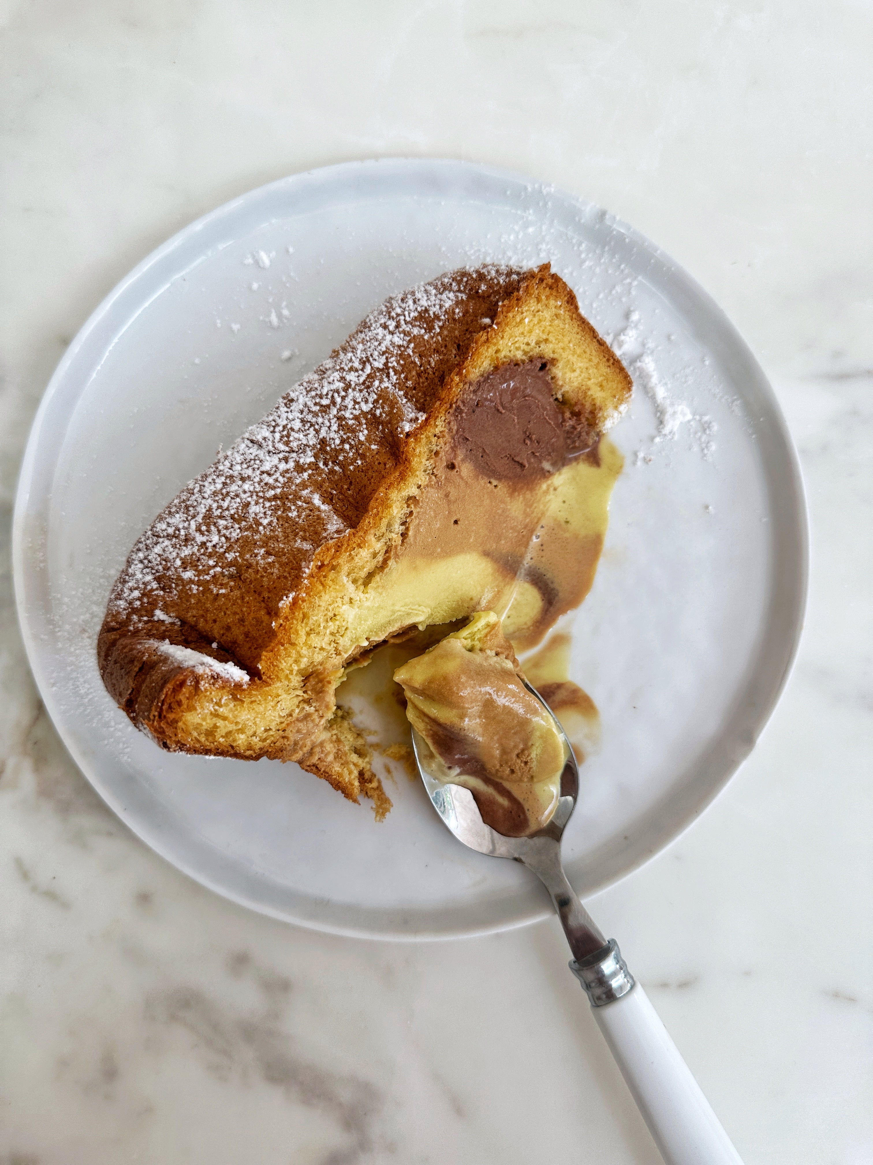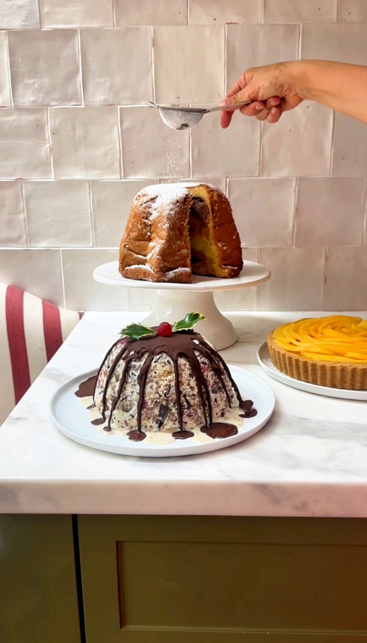 It’s as simple as cutting out the inside of the Pandoro and filling with your favourite gelato. I’ve gone with chocolate, pistachio and dulce de leche, but you do you. Layering it scoop by scoop will give you that marble effect when you cut open. Then simply, pop the lid back on. Wrap up in its bag. And freeze overnight (or for up to 5 days). Finish with a snowfall of icing sugar just before serving!
