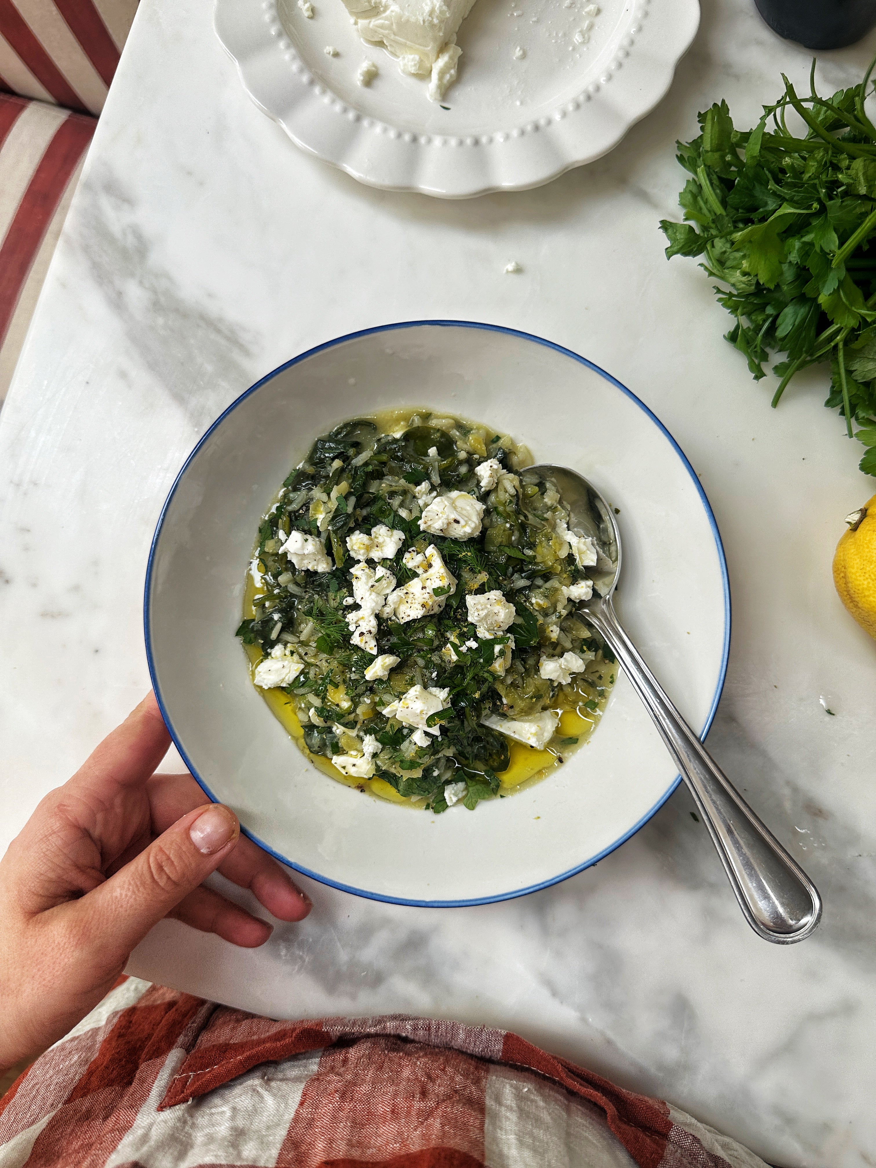 This is a rather loose recipe as it does come down a bit to personal taste – I love it extra brothy, swimming in olive oil, with lots of lemon and feta, but you do you. Taste and adjust to your liking (like all home cooking should be!)