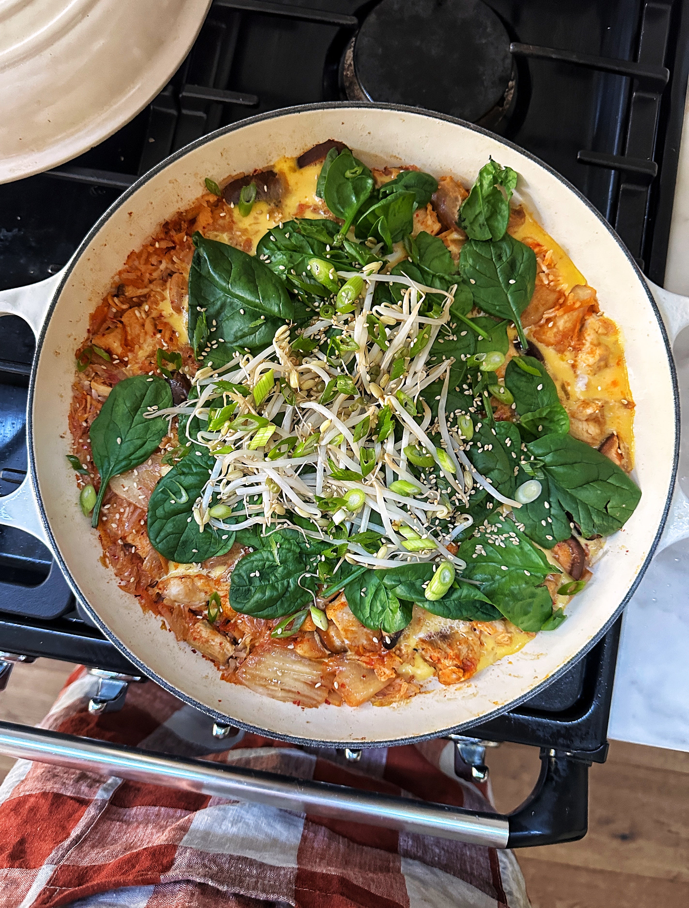 I’ve got another one-pot chicken and rice for you—and this one’s a beauty. I’m leaning on kimchi and gochujang, the deeply savoury Korean chilli paste, to do the heavy lifting. Heat levels will vary depending on the brand, so adjust to your liking.